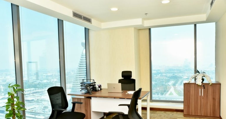 With four desks, this private office space is perfect for those in need of a serviced office. It has a window view, allowing plenty of natural light to enter the room and internal lighting as well. All of this comes at an amazing price of AED1864 per week - that's AED8100 per month - with 10% off! Enjoy the benefits of having 24/7 access, administration support, balcony/outdoor space, meeting room, reception services, telephone answering and storage facilities within The H Hotel. Make sure to take a break and grab some yummy food from either Golden Tasty Cafeteria or Cafe Java. This 4 desk private office space is available now and won't last long; so don't miss out on this great deal!